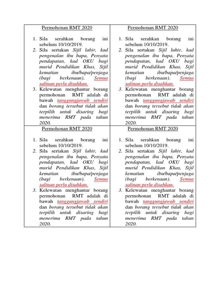 Related : Borang Permohonan Rmt 2017 / Lampiran 1 permohonan baru sambung semula borang permohonan tahun 2018 bantuan rancangan makanan tambahan (rmt) kementerian pelajaran malaysia (i) permohonan ini akan dibatalkan sekiranya butiran yang diberikan tidak lengkap atau tidak benar..