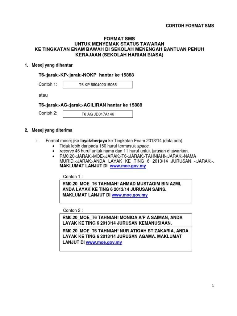 Tawaran kemasukan ke tingkatan enam bawah 2010. 0⃣6⃣ print keputusan tawaran anda untuk kegunaan semasa melapor diri nanti. Keputusan kemasukan ke sekolah menengah bantuan penuh kerajaan tingkatan 6 akan diumumkan melalui laman sesawang kementerian pendidikan malaysia. Sila taipkan maklumat seperti berikut untuk membuat semakan melalui sms : Pelajar yang berjaya boleh mencetak surat tawaran dengan klik hantar selepas permohonan berjaya dipaparkan dan jika terdapat sebarang pertanyaan mengenai pengambilan kemasukan ke tingkatan 6, sila hubungi jabatan pelajaran negeri yang terdekat atau.