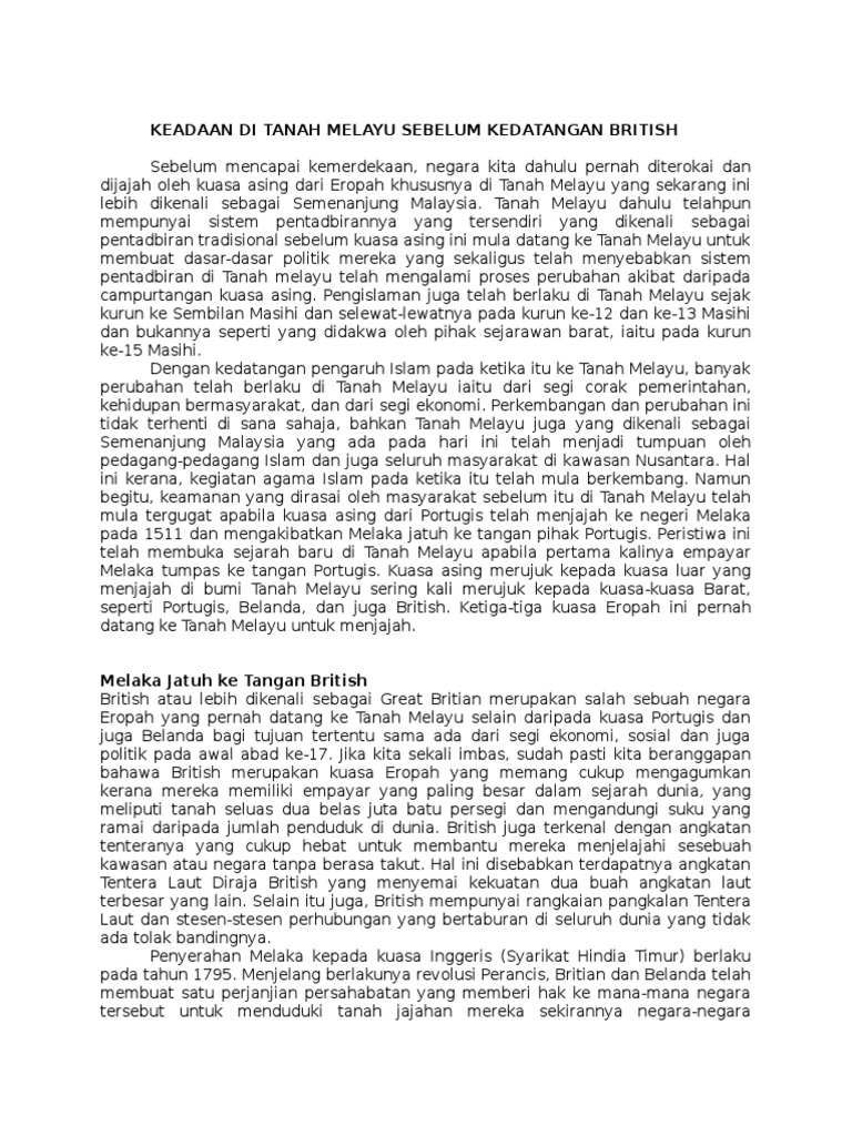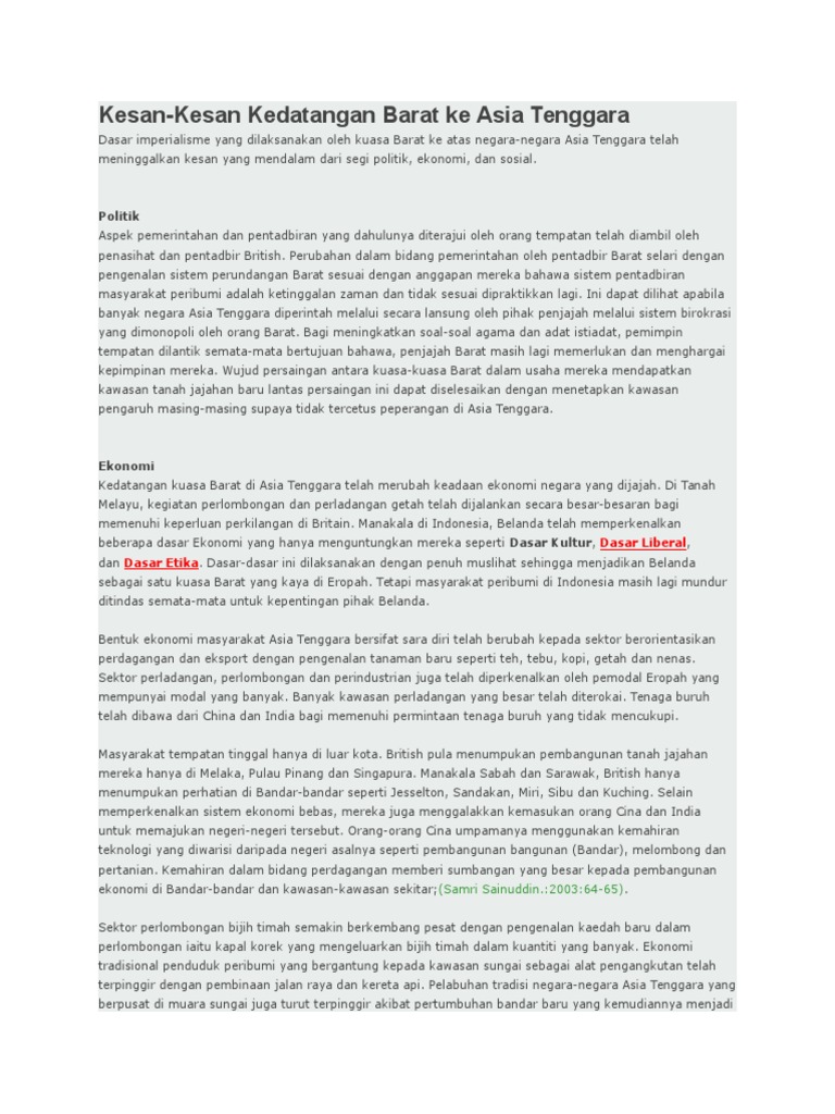Apakah faktor kedatangan kuasa barat pada sekirat abad ke 17 dan 18 ? Kesan sosial, ekonomi dan politik. Penjajahan portugis di tanah melayu kejatuhan melaka ke tangan orang portugis berlaku. Implikasi yang besar terhadap ekonomi di tanah melayu terutamanya dalam perusahaan bijih timah. Kamu bisa melihat contoh surat hibah surat hibah tanah. Setelah kedatangan british ke tanah melayu, implikasi politik yang paling ketara adalah berlakunya penghakisan kuasa sultan dan pembesar di negeri melayu (gullick, 1948). Hasil bijih timah & getah tidak dapat dieksport ke barat. Tujuan utama kedatangan islam ke tanah melayu sudah semestinya untuk menyebarkan serta. British merupakan kuasa barat paling lama dalam menjajah negara kita bermulanya pertapakan bristish di pulau pinang. Kedatangan islam ke tanah melayu terpaksa menghadapi persaingan agama hindu kesan pengislaman brunei wilayah sekitar seperti sulu da mindanao turut diislamkan. Dengan ini menyatakan bahwa pihak yang bertanda tangan kami lihat anda menikmati bacaan anda. Click here to get an answer to your question iktibar kedatangan kuasa barat ke kepulauan melayu. Kedatangan kuasa barat terutamanya british ke tanah melayu telah memberi.